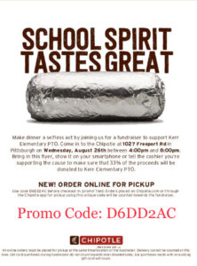 « All Events This event has passed. Chipotle – Dine & Donate August 26, 2020 @ 4:00 pm - 8:00 pm « Last Day of School! Early Dismissal PTO Meeting » Add to calendar Google Calendar iCalendar Outlook 365 Outlook Live Details Date: August 26, 2020 Time: 4:00 pm - 8:00 pm Event Categories: dine & donate, fundraiser Venue Chipotle at the Waterworks