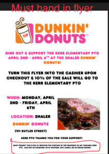 April 2-6 at the location across from Shaler Plaza. Hand in your dunkin donuts flyer 2018 for the PTO to get a portion of the proceeds!