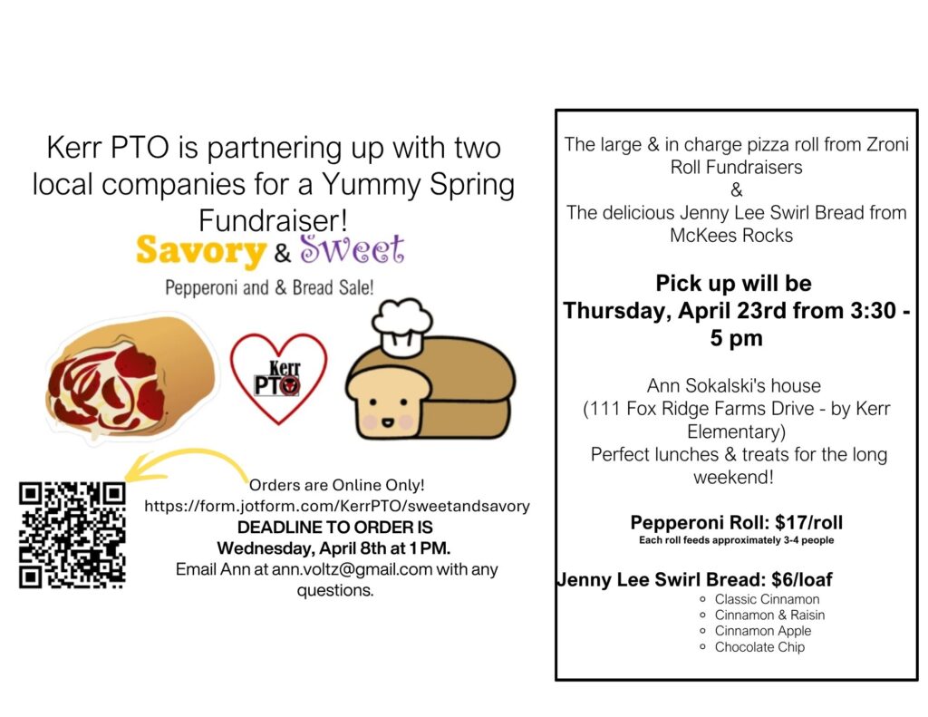 Savory and Sweet Sale! December 20, 2021 by Erin Berdik Place your order for Pepperoni and Bread to support the Kerr PTO! Orders can be placed here by April 8th.